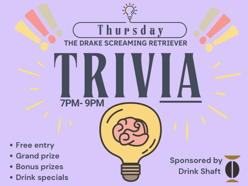 It's Trivia Night at The Drake Screaming Retriever! Bring yourself or your team on down for too much fun! Great prizes, amazing atmosphere, great deals! Test your knowledge out this week!